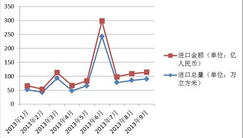 2013年三季度我国累计进口木材达2151.12万立方米,同比增长27.56%,合计金额达人民币269.97亿元。2013年前三季度我国累计进口木材达5808.98万立方米,同比增长15.8%,总金额达726.22亿元人民币。